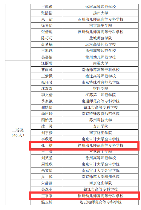 第九届江苏省师范生教学基本功大赛(学前教育组)于2020年11月6日-8日在公司举行,全省共有31所院校114名选手参赛。近日,获奖结果揭晓,公司选派的五名选手稳定发挥,全部获奖。其中,吴玥、王欣月获一等奖,张靖晗获二等奖,孔祺、王亭亭获得三等奖。公司获优秀组织奖。