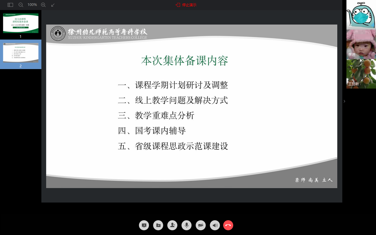 随后,孟子郁介绍了《幼儿园课程》省级课程思政示范项目的进展情况,对课程基础资料的收集、整理和调整做了分工,积极推进课程建设。王丽新教授指出课程思政元素需要多进行讨论来确定,强调理实结合。