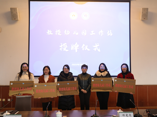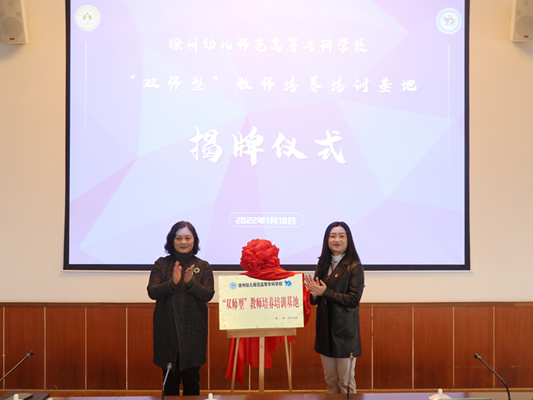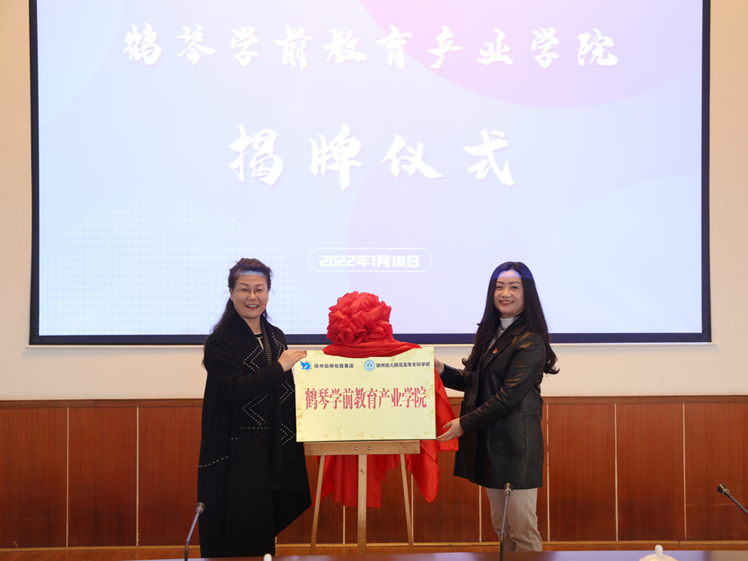 接着,曹利群董事长为“鹤琴学前教育产业学院”揭牌,并聘请徐剑媚为产业学院经理。邓董事长与徐总董事长分别代表徐州幼专与徐幼集团签署“鹤琴学前教育产业学院”合作协议。最后,组织人事处李慧副处长为“徐州幼专双师型教师培养培训基地”揭牌,王清风经理为“教授幼儿园工作站”授牌,徐剑媚总董事长为五位教授颁发了聘书。