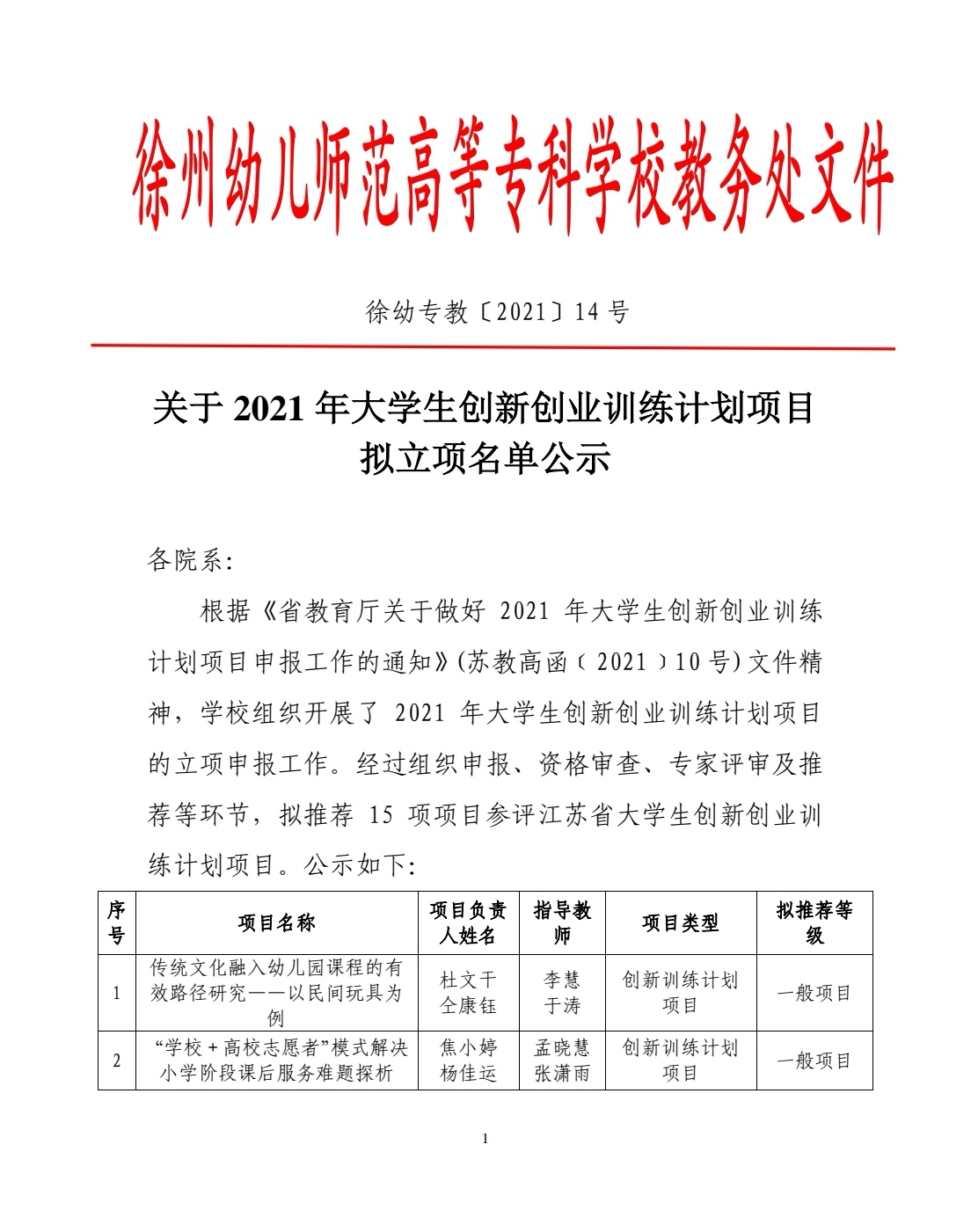 根据徐幼专教[2021]14号文件发布了《关于2021年老员工创新创业训练计划项目拟立项名单公示》学院共有8个项目顺利获得立项。